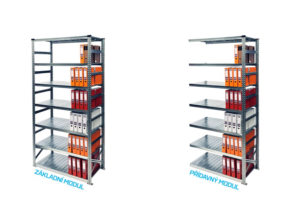Archivní regál na šanony, 2500x1350x600 mm, 7 polic, přídavný