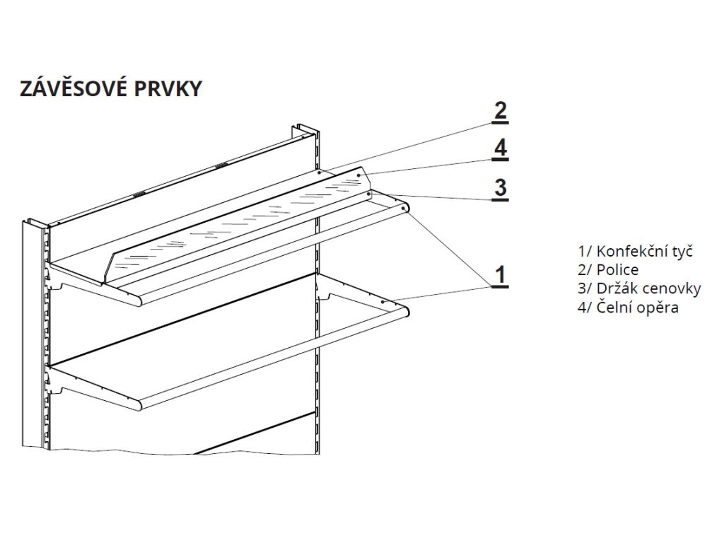 Konfekční tyč regálového systému SU5 je určena pro zavěšení do stojin regálu pomocí dvou speciálních konzol (součást dodávky). Tyč tvoří chromovaná ocelová trubka o průměru 25 mm, která slouží k přehlednému vystavení oděvů na ramínkách v prodejních regálových systémech