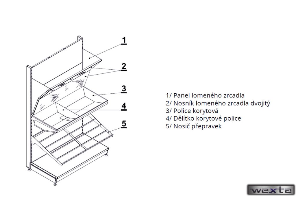 Panel lomeného zrcadla 1330 × 350 mm je kovový prvek s pevně nalepeným zrcadlem, navržený pro použití v rámci regálového systému SU5. Ve spojení s nosníky lomeného zrcadla a korytovou policí tvoří atraktivní a funkční dekorativní doplněk, ideální zejména pro vystavení ovoce a zeleniny.