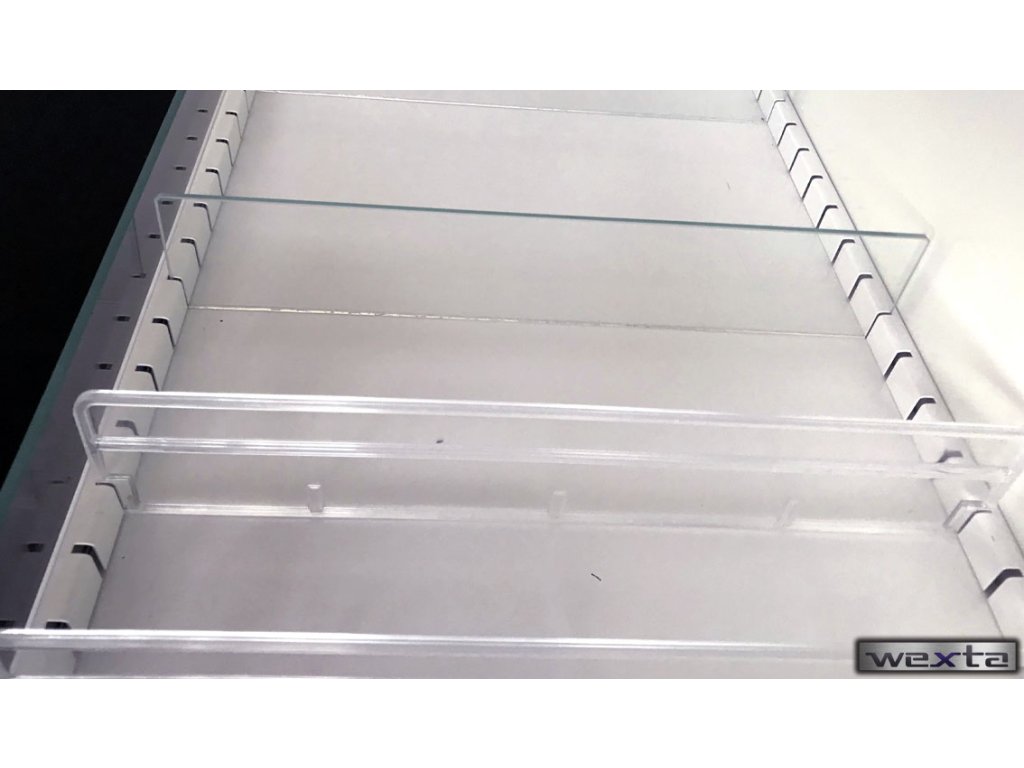 Kovová police regálového systému SU5-ELEGANT je kvalitní a pevná úložná plocha vhodná do prodejny a obchodů. Na přední straně má připravené otvory pro držák cenovky, do kterého lze vložit čelní opěru, cenovkovou lištu, hřeben i dělítko. Díky tomu je zboží vždy přehledně oddělené a uspořádané.